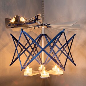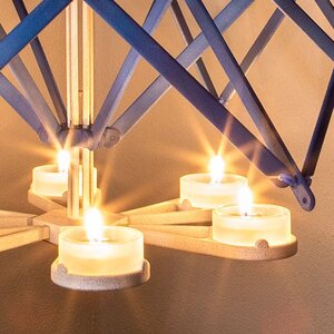 Gläserne Teelichttüllen bringen das natürliche Flammenspiel zur Geltung und schaffen eine warme, stimmungsvolle Atmosphäre. Das Flügelrad nutzt den Wärmefluss der Teelichte für eine sanfte Drehbewegung, während die verspiegelten Flächen faszinierende Licht- und Schatteneffekte in alle Raumrichtungen projizieren.